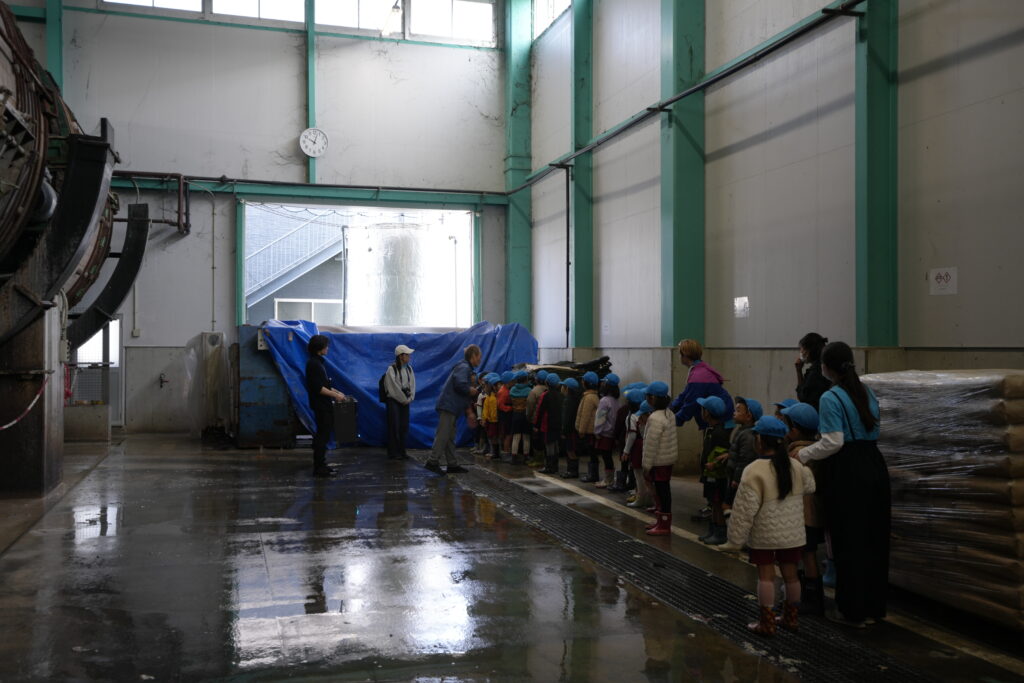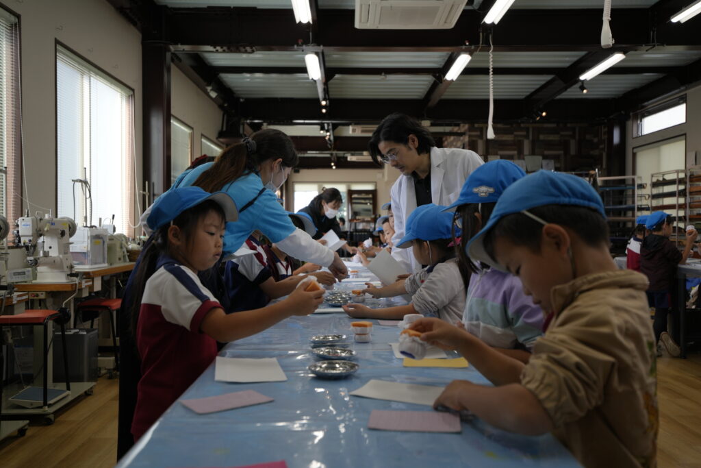 認定こども園「ちいろば保育園」。なめし工場を見学したあと、ペレテリアで革に色付体験してキーホルダーを作りました。